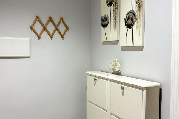 Het appartement is verdeeld over één verdieping. De hal leidt ons via de gang naar de verschillende kamers.